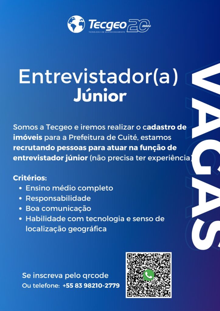 A Tecgeo, empresa responsável pelo projeto do Plano Diretor de Cuité, está com vagas abertas para o cargo de entrevistador júnior, para atuar no cadastro de imóveis urbanos do município de Cuité. A oportunidade é voltada para candidatos com ensino médio completo e não exige experiência profissional prévia. Os selecionados irão desempenhar atividades como cadastramento […]